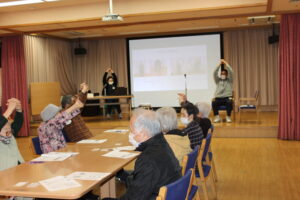 仁和会総合病院の先生たちが来園なさり、本日は介護予防講座を行いました。日頃動かしていない身体を、先生の講座を聞いて身体の部位を意識しながら効果的に、健康的に動かすことで明日、また未来へ身体機能を維持していくためにみなさま、参加していました。